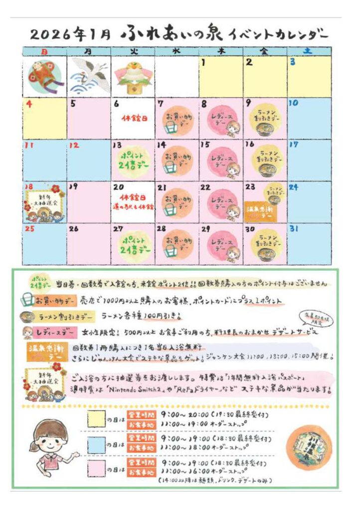 1月のイベントカレンダー 2025.12.28 最終更新日時 : 2025.12.28 info いつも川根温泉ふれあいの泉をご利用いただき、誠にありがとうございます。新年は、18日に年に一度の大抽選会を開催!豪華賞品を準備して皆様のお越しをお待ちしております。新年も川根温泉をご愛顧賜ります様、お願い申し上げます。
